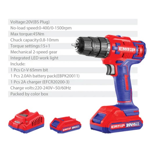 Package Includes: 1 Piece of EMTOP Lithium-Ion Cordless Drill 45Nm – ECDL620011-3 with Battery Pack & Charger